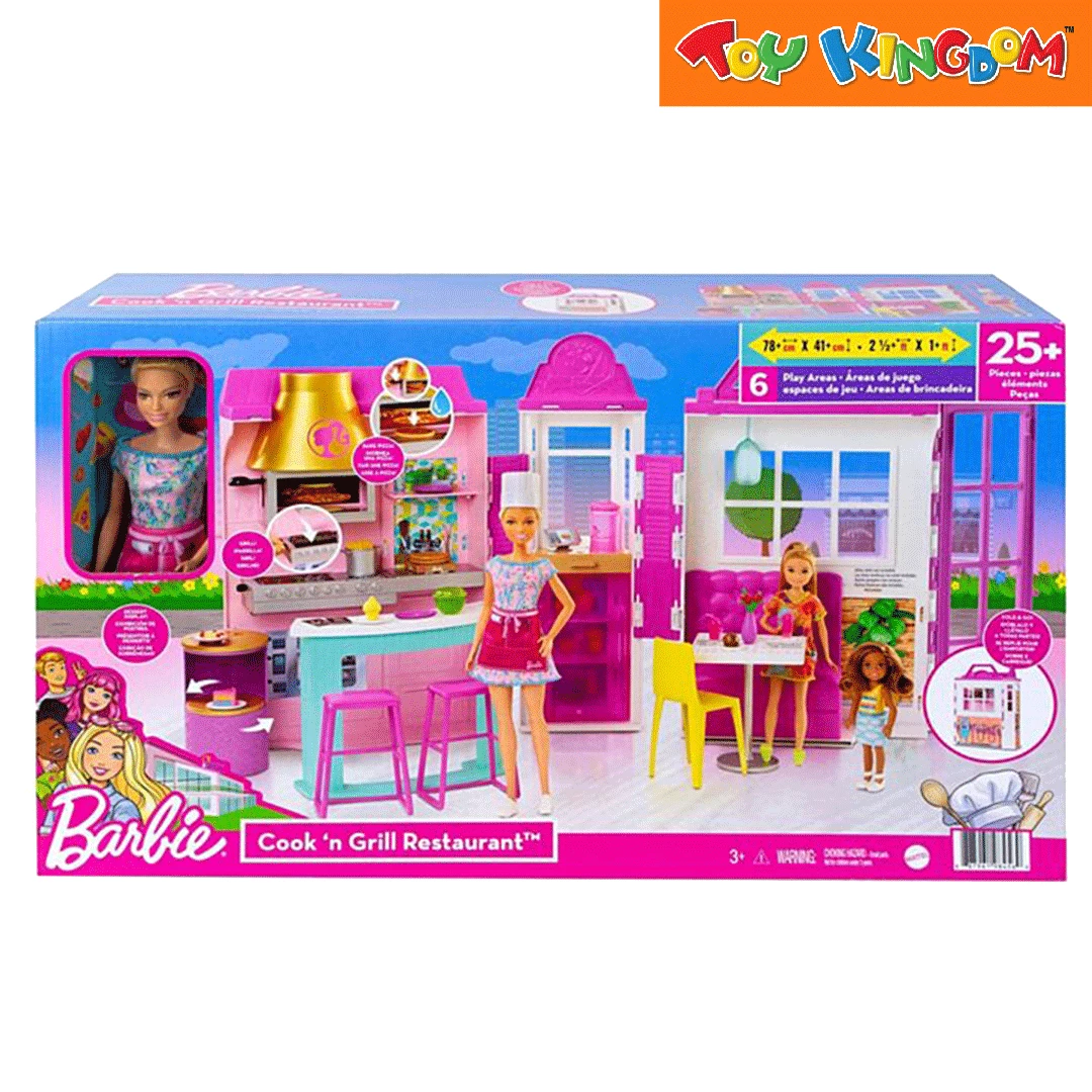 - Serve up storytelling fun with the Barbie® Cook ‘n Grill Restaurant™ doll and playset featuring a modern design, 6 play areas and 30+ total pieces!