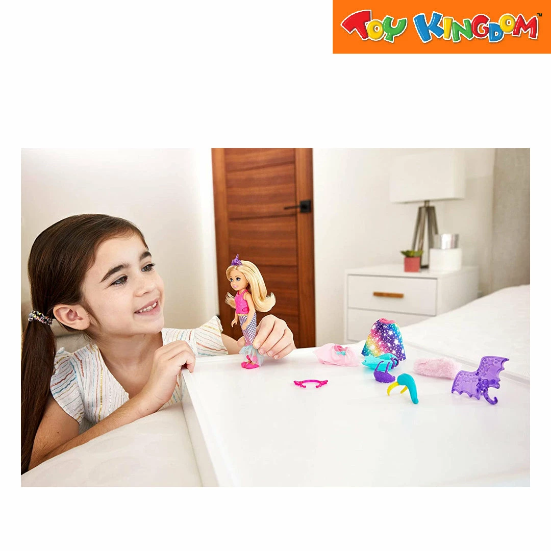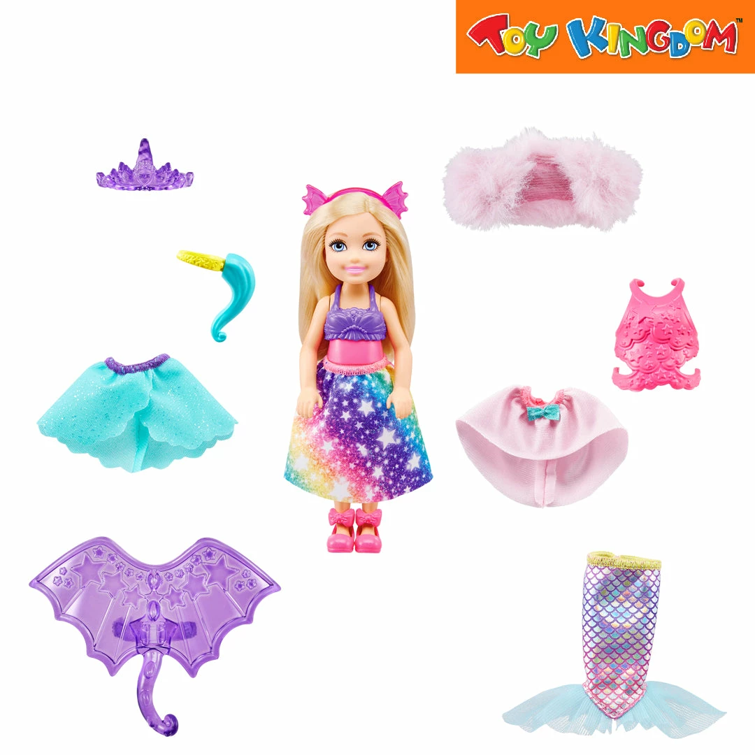 - With 12 fashion pieces, kids can dress Chelsea doll as a princess, mermaid, unicorn or dragon, or mix and match to create their own fairy tale character.