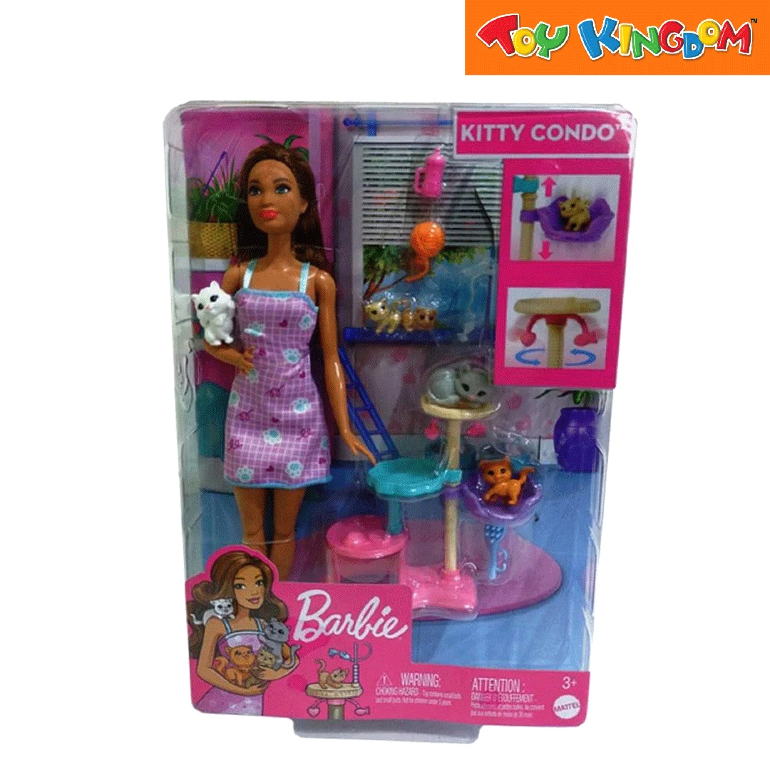 - Help Barbie doll care for 1 cat and 4 adorable kittens in their adorable Kitty Condo playset!