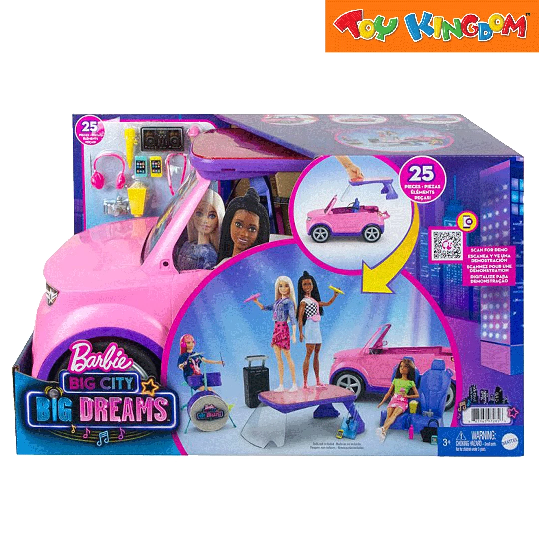 - This Barbie® vehicle playset inspired by Barbie: Big City, Big Dreams™ transforms to reveal a stage and seating for a pop-up performance!