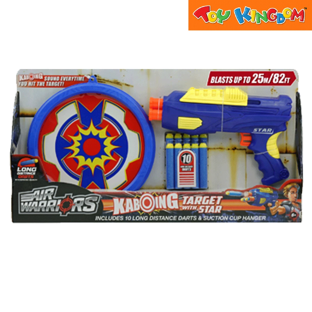 - Item includes dart blaster and 10 long distance darts and kaboing target