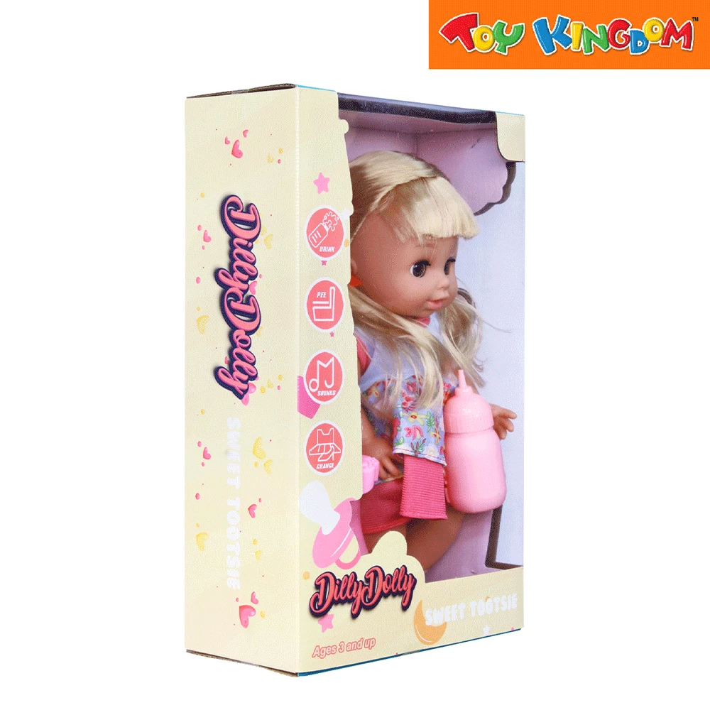 - Dilly Dolly Baby Dolly can create 12 different baby sounds. It has a built in touch sound sensors for interaction function. It has a drink and pee function for more realistic playtime