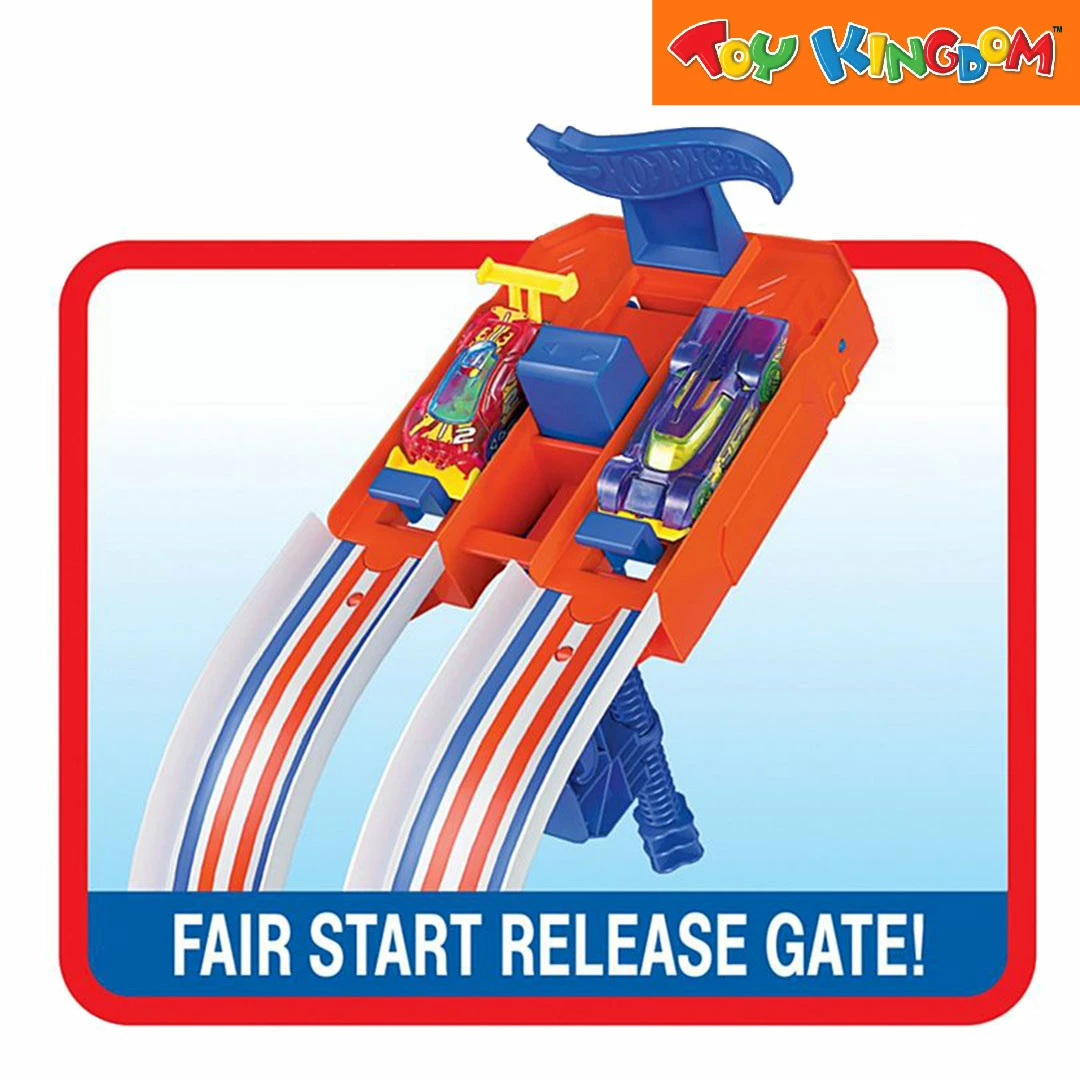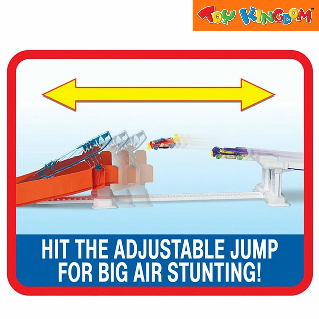 - The Hot Wheels® Drop Race Jump track set is perfect for on-the-go play with friends or playing alone. It also tests the vehicles that go the fastest.