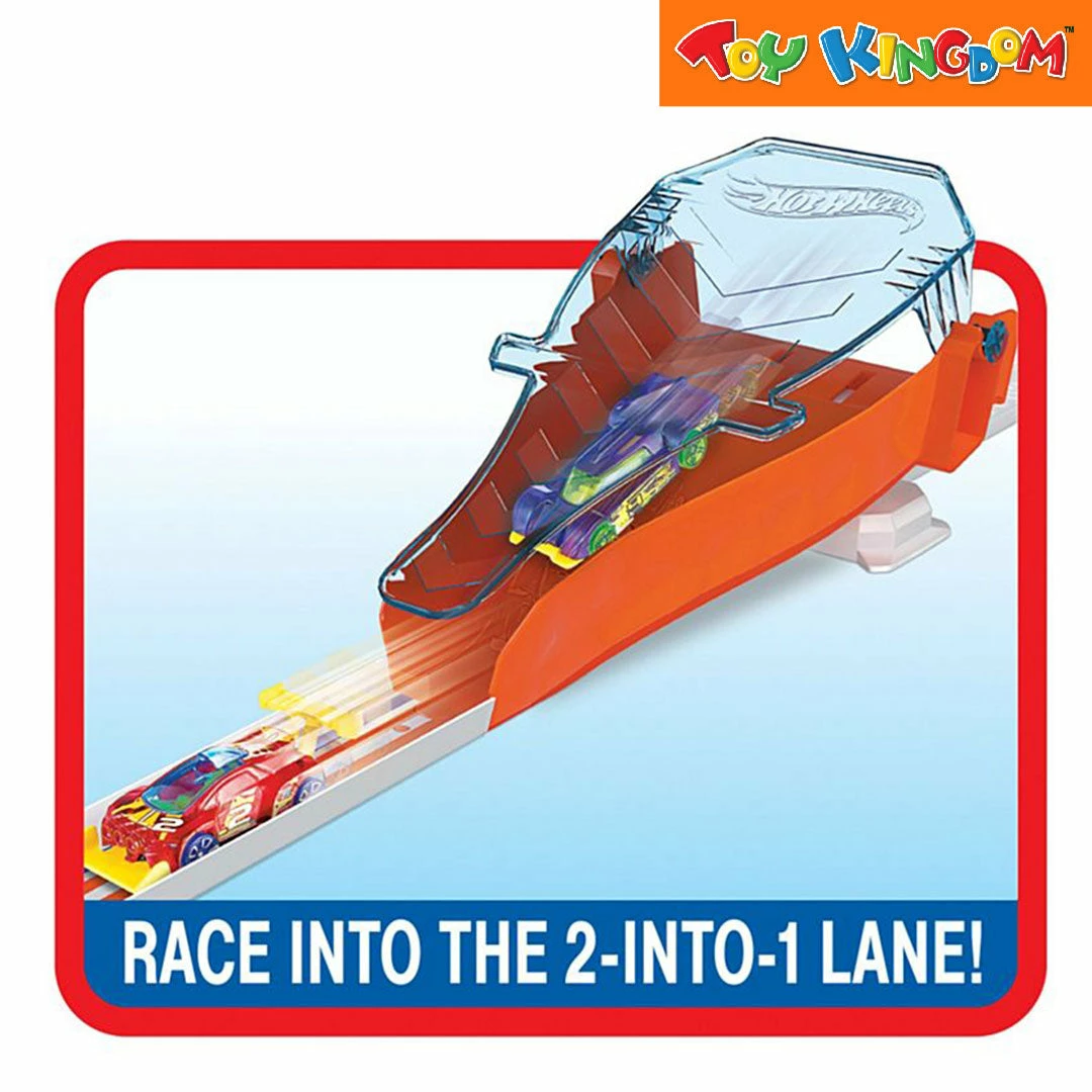 - The cars launch off the track into the air and if they both land on the finish, only one will make it out of the 2-in-1 lane eliminator!