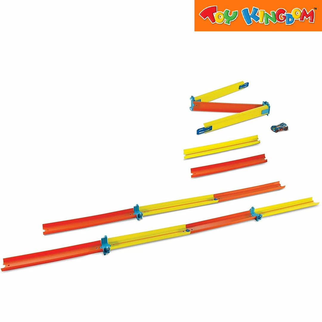 - With 12 feet of straight track and 5 hinge connectors that fold both ways for easy storage. Includes a Hot Wheels® 1:64 scale vehicle.