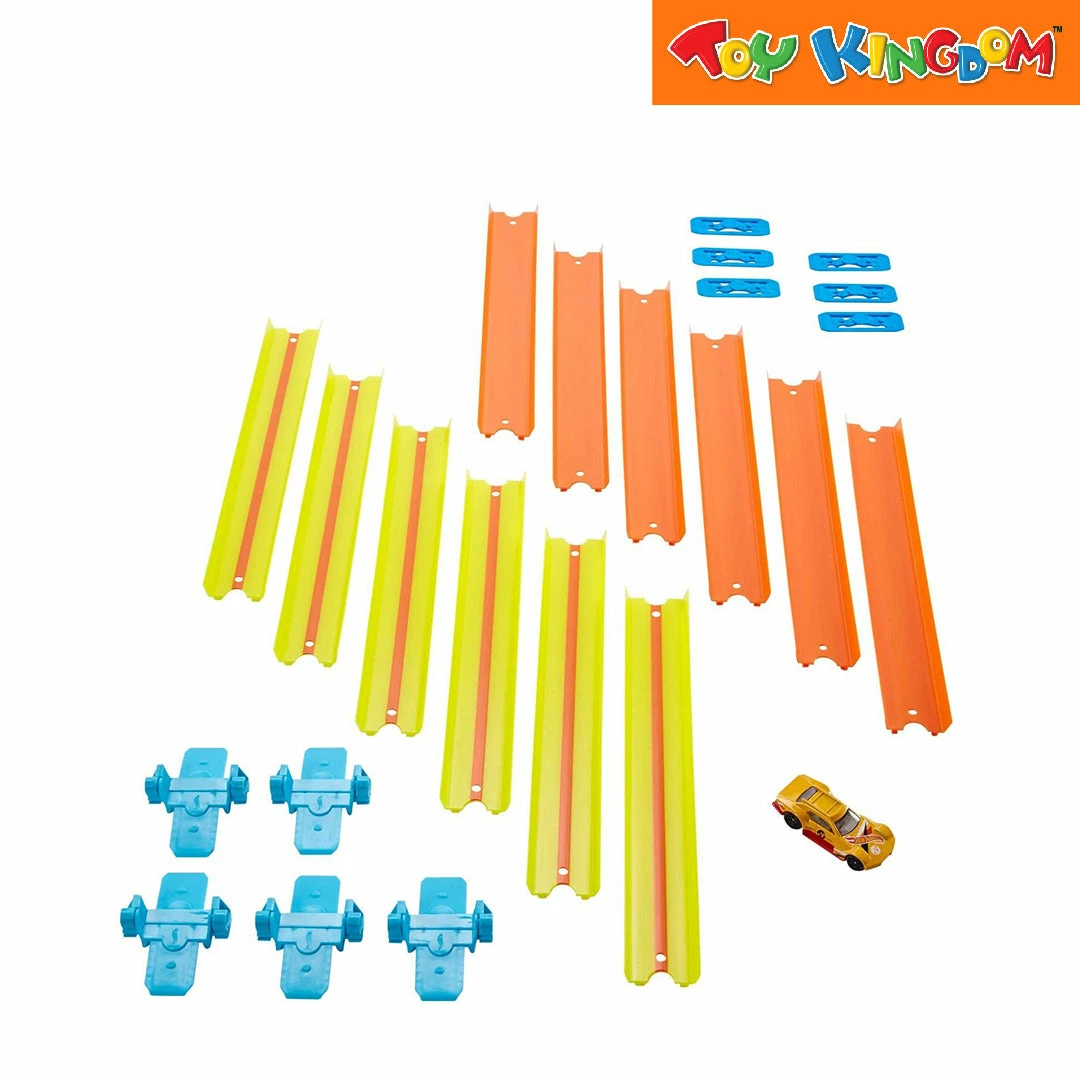 - Kids can create a dynamic route through any build with the track pack, lengthening the race or transitioning to a stunt