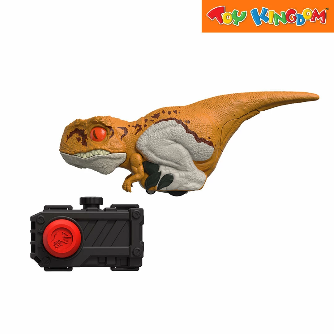 - About 6 inches long, this Uncaged Click Tracker Atrociraptor orange dinosaur comes with a clicker control that makes it spin, move and make sounds. Watch out, it’s still wild and unpredictable!