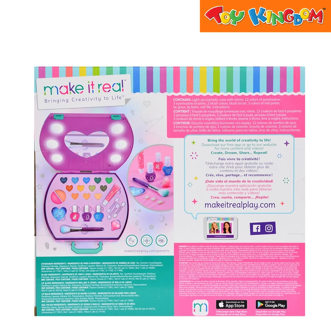 - This glam heart-shaped case features an illuminated mirror and all the fun dress-up cosmetics needed to create bright, picture-perfect manis and matching makeup looks.