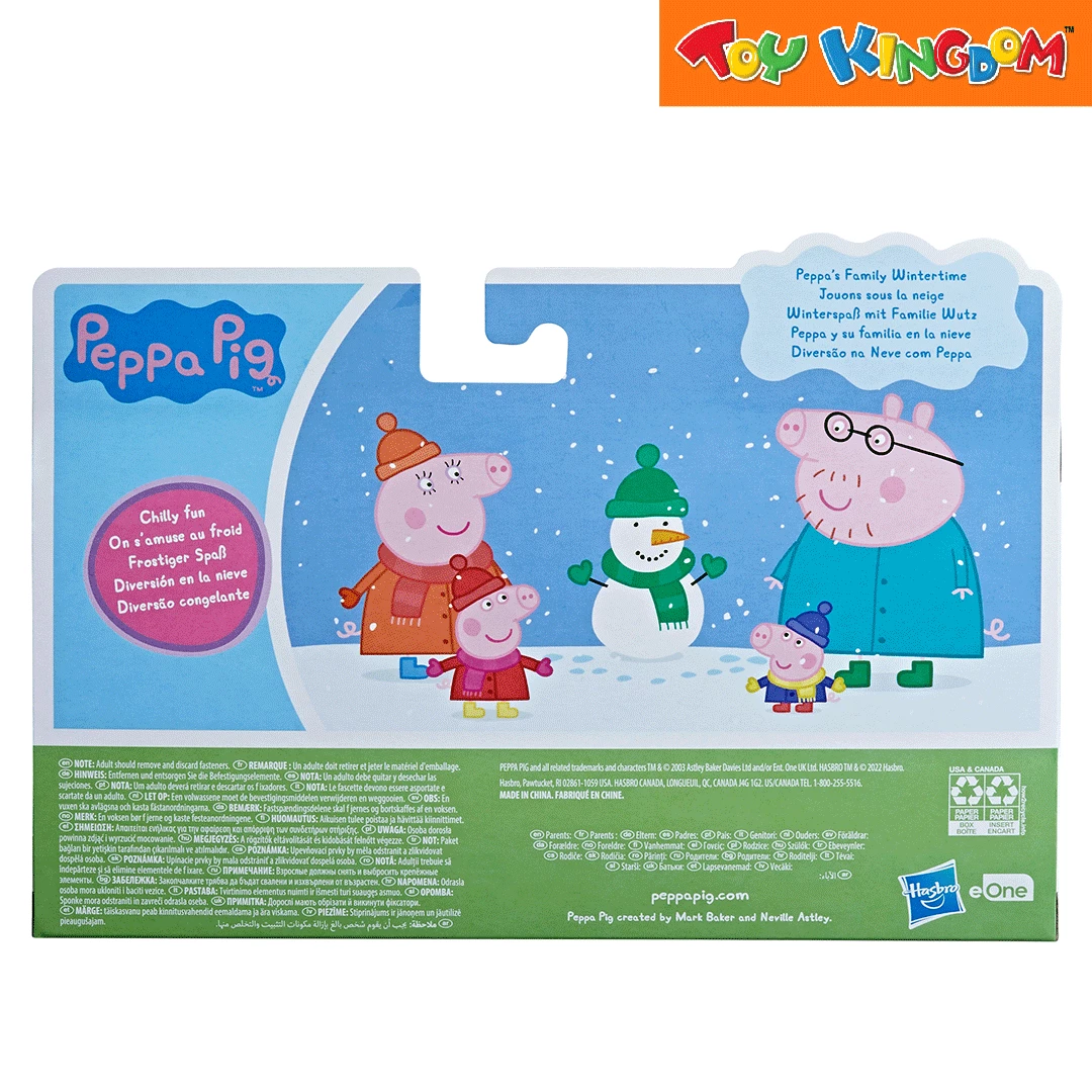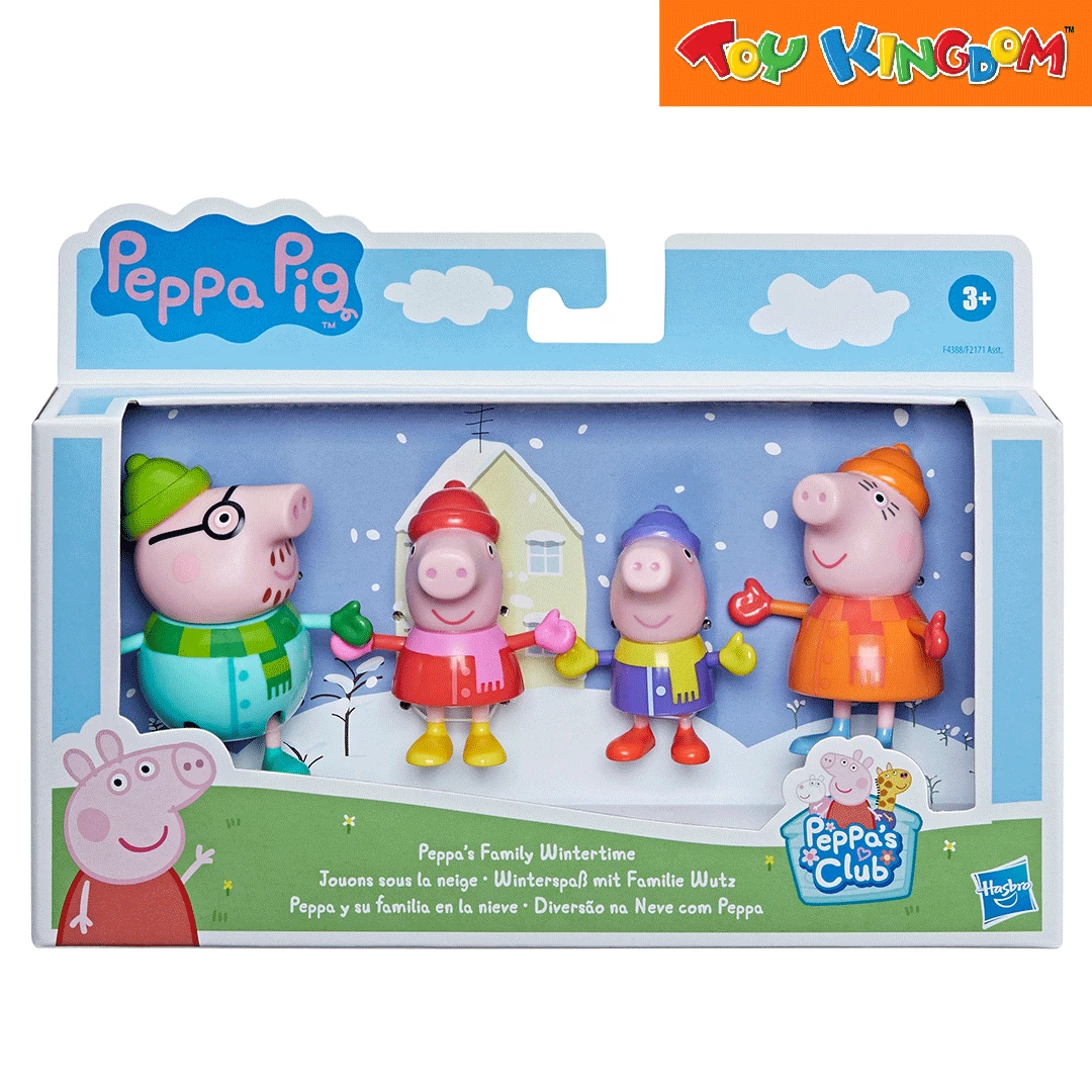 - The Peppa’s Family Wintertime set of figures includes all 4 family members in their cold-weather outfits, complete with hats, scarves, and mittens